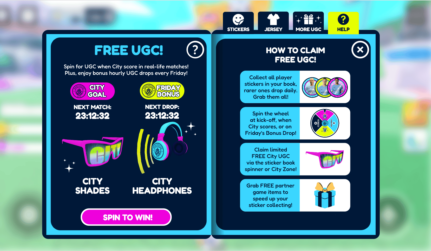 → The team have integrated with five popular experiences (The Floor is Lava, Team Work Puzzles, and more) to host Man City Zones where players can collect stickers.
