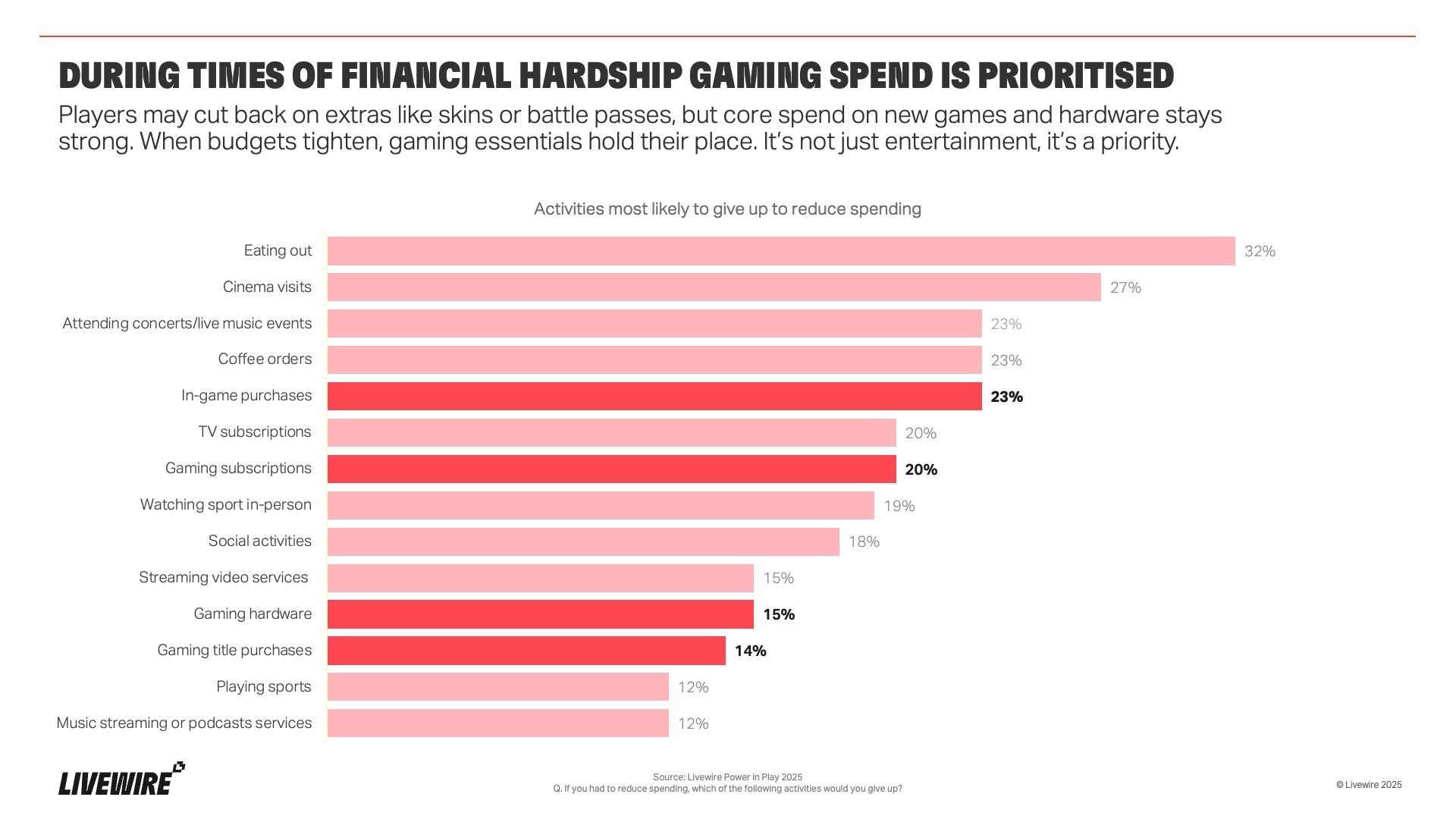 When budgets tighten, gaming stays. The study shows that gaming is one of the last categories people cut; ranking above film, music, and live events.